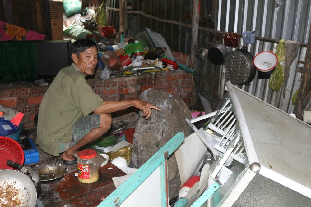 Sát nhà ông Dương, nhà ông Huỳnh Thanh Phong cũng bị một tảng đá khác lăn xuống đè lên nhà gây hư hỏng tài sản. Rất may là thời điểm này nhà ông Phong không có người ở nhà.