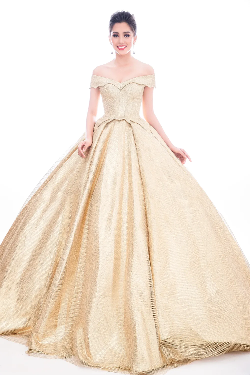 Những chiếc đầm dạ hội lần này được nhà thiết kế Lê Thanh Hoà thiết kế riêng cho Tiểu Vy mang đến Miss World