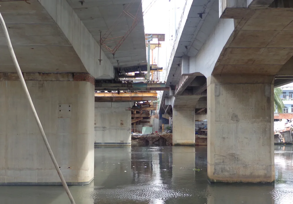 Phía dưới kênh Đôi, các loại xà lan, phương tiện thi công tập trung để đưa vật tư lên mặt cầu phục vụ cho việc đẩy nhanh tiến độ xây lắp.