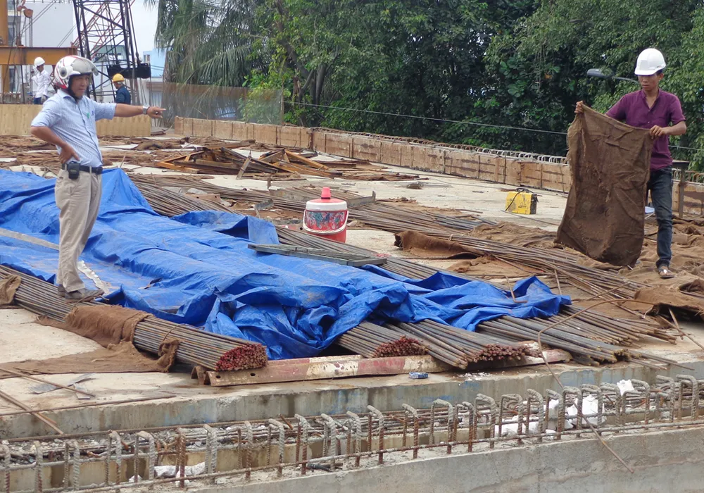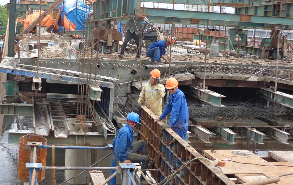 Nhịp biên đúc hẫng nối nhịp chính giữa kênh Đôi với bờ phía quốc lộ 50 đang được gấp rút thi công để vào cuối tháng 8 này tiến hành hợp long.