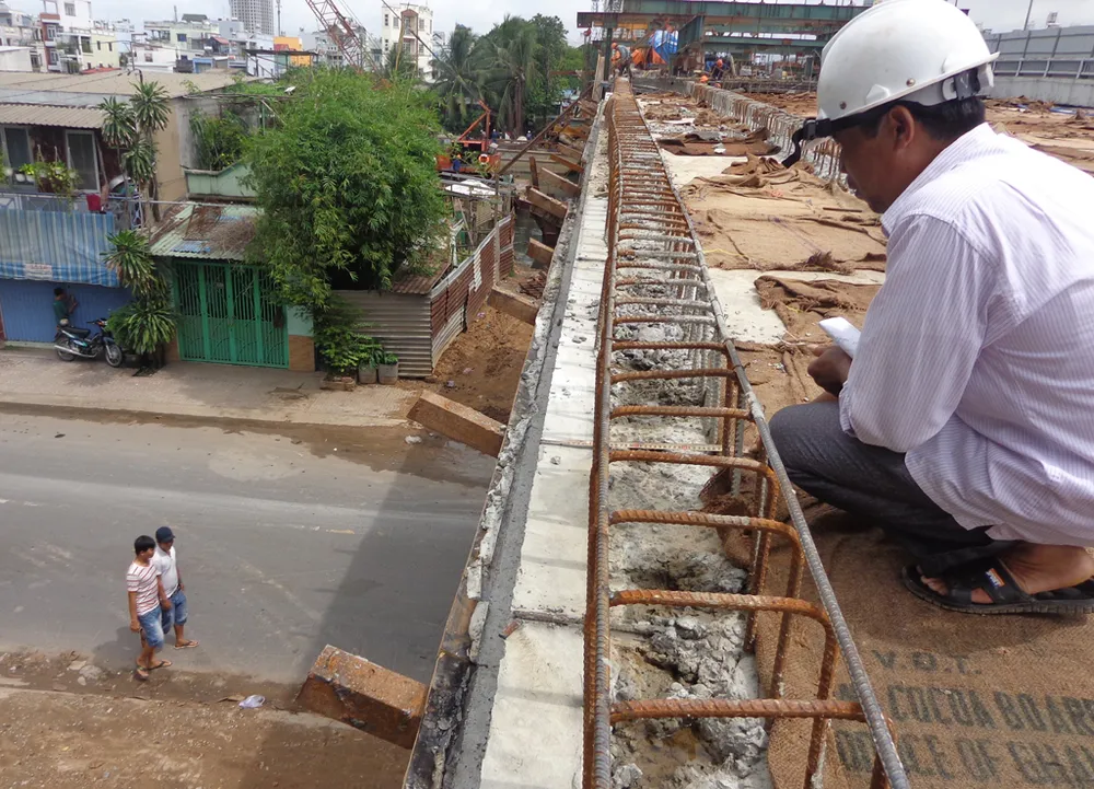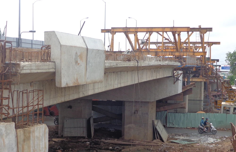 Nhịp cầu vượt phía trên mặt đường Phạm Thế Hiển được chuẩn bị cho việc đổ bê tông tường chắn thành cầu.