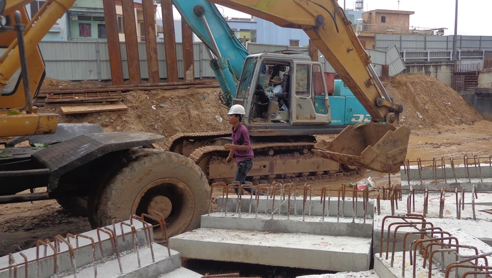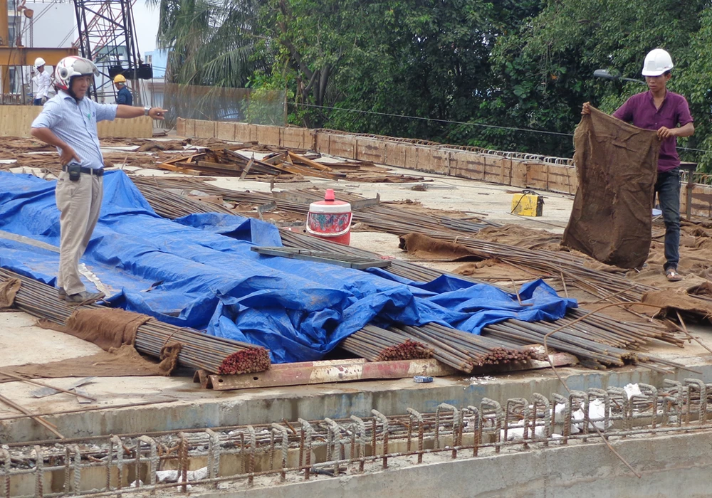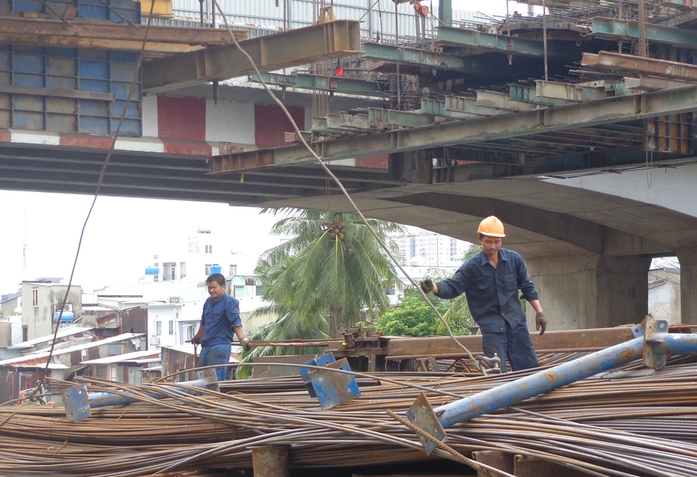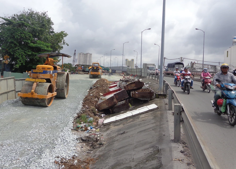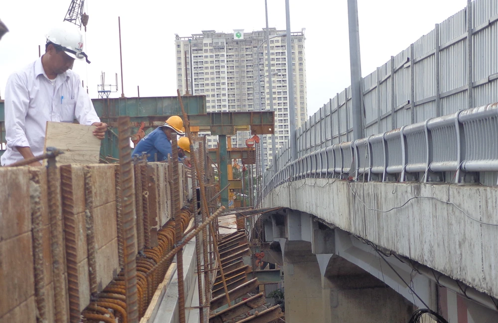 Việc thi công đường dẫn từ phía Chợ Lớn lên cầu đang được gấp rút thi công.