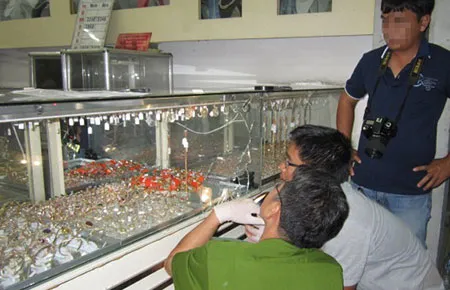Công an khám nghiệm hiện trường vụ cướp tiệm vàng Kim Nguyệt. Ảnh: HV