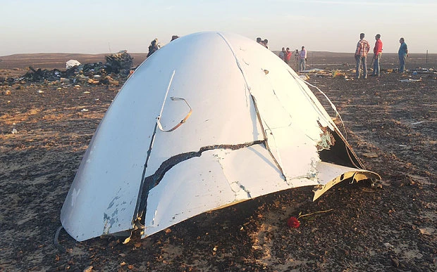 Mảnh vỡ máy bay Nga sau vụ nổ ở bán đảo Sinai, Ai Cập. Ảnh: Telegraph