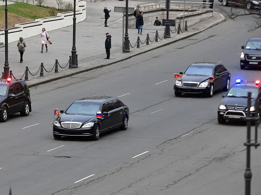 Sau màn duyệt binh danh dự, ông Kim nhanh chóng bước vào một chiếc Mercedez-Benz màu đen của mình đậu trước nhà ga. Chạy theo ông vẫn là nhóm 12 vệ sĩ quen thuộc.