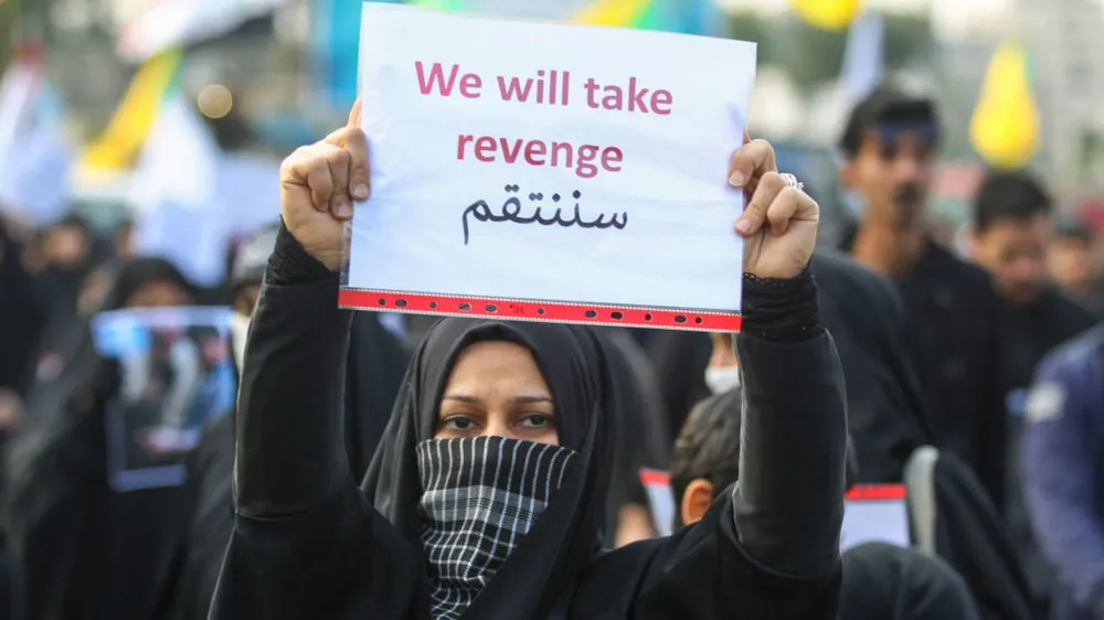 Người dân Iran giơ cao biểu ngữ trả thù cho Tướng Soleimani vừa bị Mỹ sát hại. Ảnh: Sky News