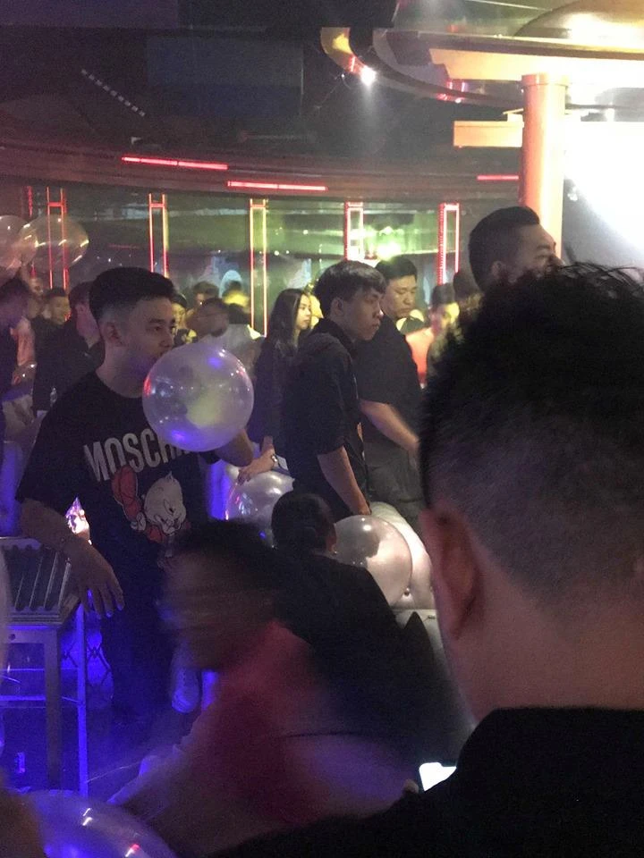 Đáng chú ý trong những tấm hình này xuất hiện những quả bóng nghi là bóng cười (được bơm bằng khí cười - N2O - một loại chất kích thích có thể gây nghiện).