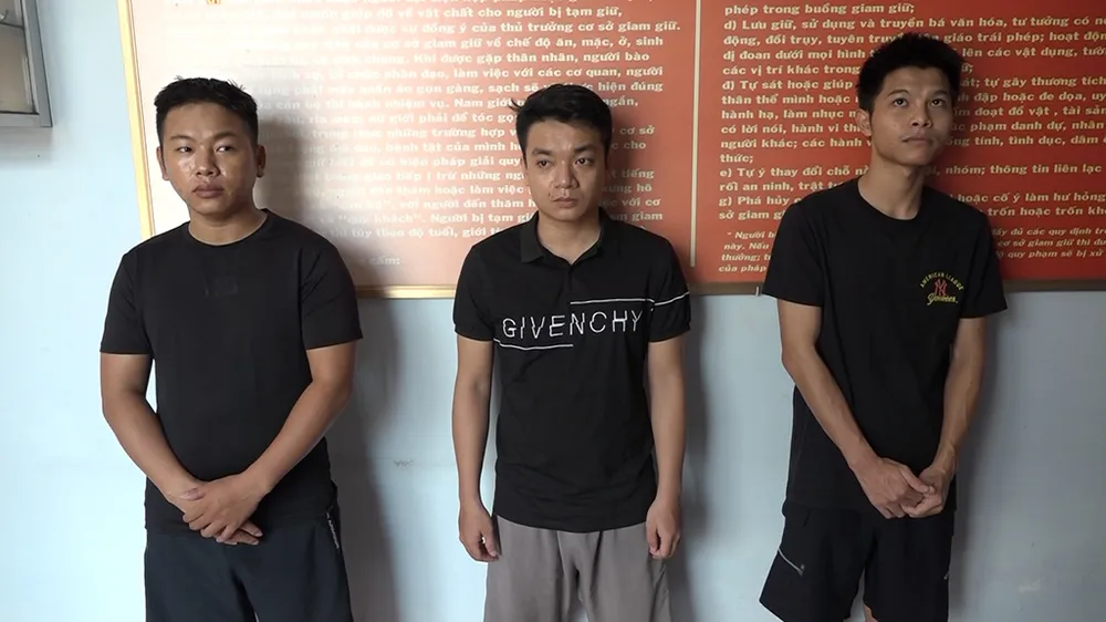 Nhóm Đạt, Văn Duy và Đức Duy (từ trái qua) tại cơ quan điều tra. Ảnh: CA
