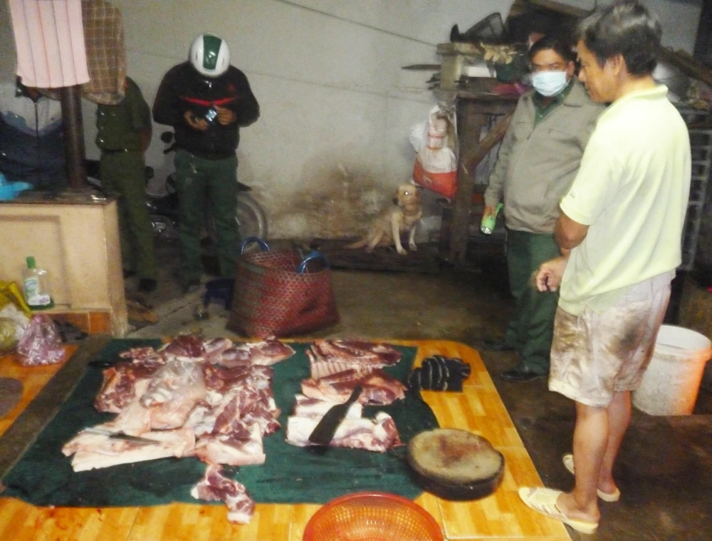 Ngay thời điểm kiểm tra, đoàn ghi nhận ông Học và vợ đang giết mổ một con heo trên nền nhà dơ bẩn. Cạnh đó, ba con heo chờ mổ bụng, cạo lông đang được nhốt trong chuồng.