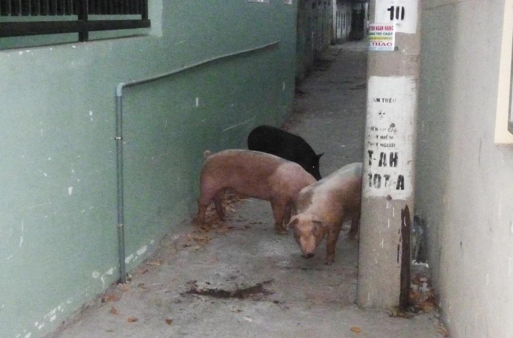 Ba con heo sống bị người nhà ông Học lùa ra đường. Ảnh: TRẦN NGỌC.
