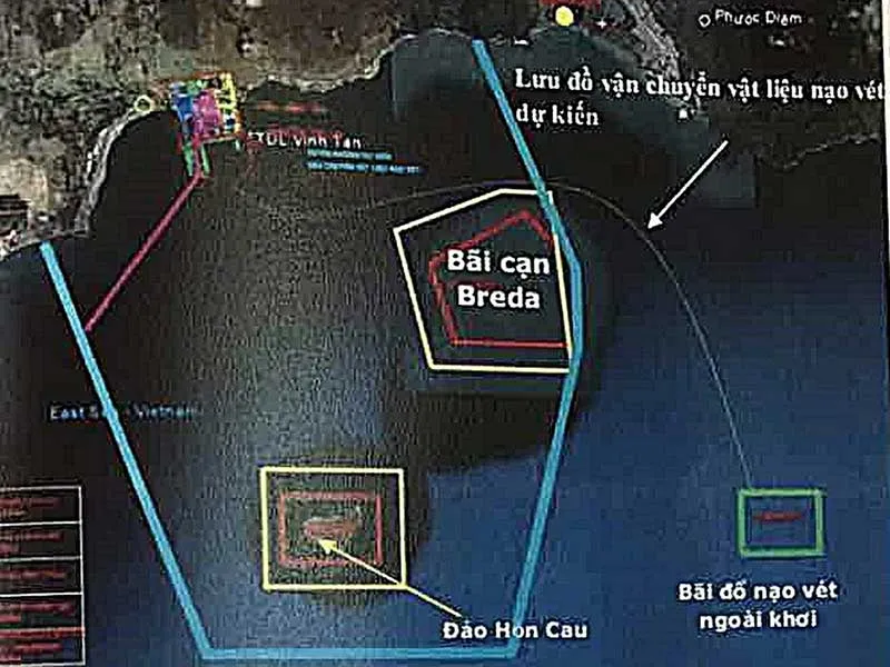 Lưu đồ vận chuyển vật liệu nạo vét cho thấy bãi đổ thải rất gần Hòn Cau. Ảnh: PN