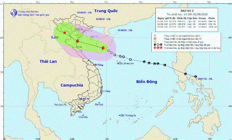 Dự báo đến 13 giờ ngày 2-8, vị trí tâm bão ở khoảng 19,5 độ Vĩ Bắc; 105,8 độ Kinh Đông, ngay trên vùng bờ biển các tỉnh Bắc Trung bộ và Nam đồng bằng Bắc bộ.