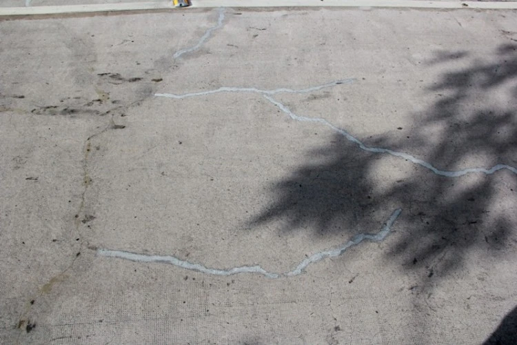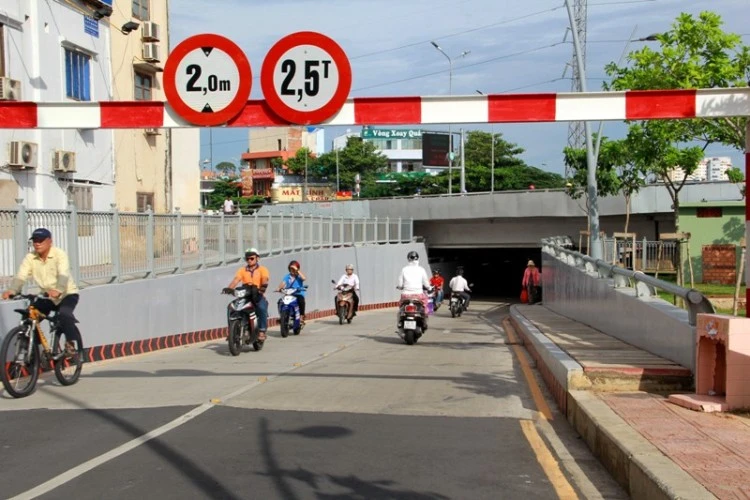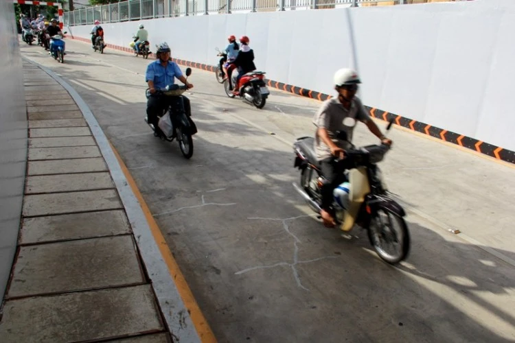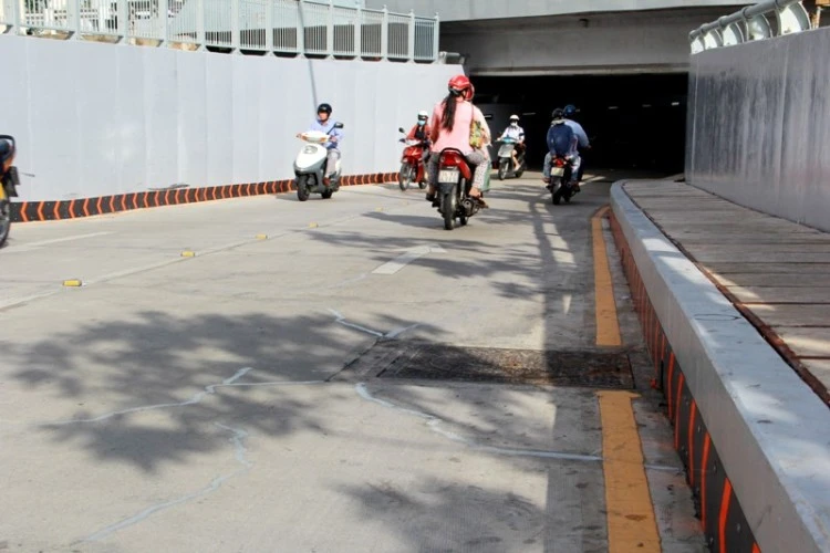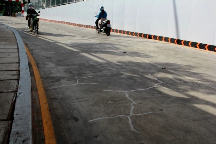 Hàng chục vết nứt đã được vá lại, trong đó nhiều vết chồng chéo nhau, kéo dài từ 3-5 m, nhiều vết kéo dài qua hết bề rộng của hầm chui.