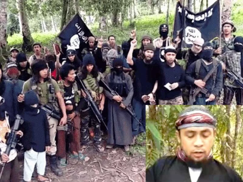 Ảnh lớn: Các thành viên của nhóm khủng bố Abu Sayyaf đang làm mưa làm gió ở Philippines. Ảnh: BBC. Ảnh nhỏ:Isnilon Hapilon, thủ lĩnh của Abu Sayyaf, đọc tuyên bố trung thành với IS trong một video. Ảnh: PHIL STAR