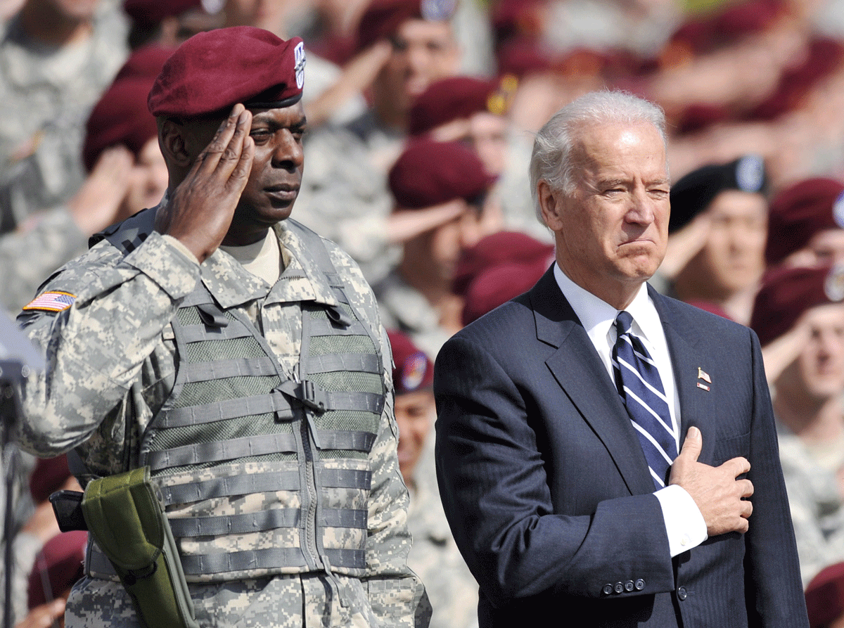 Ông Joe Biden (phải) thời còn là phó tổng thống Mỹ và tướng Lloyd Austin tại một buổi lễ ở căn cứ Fort Bragg, bang North Carolina (Mỹ) ngày 8-4-2009.