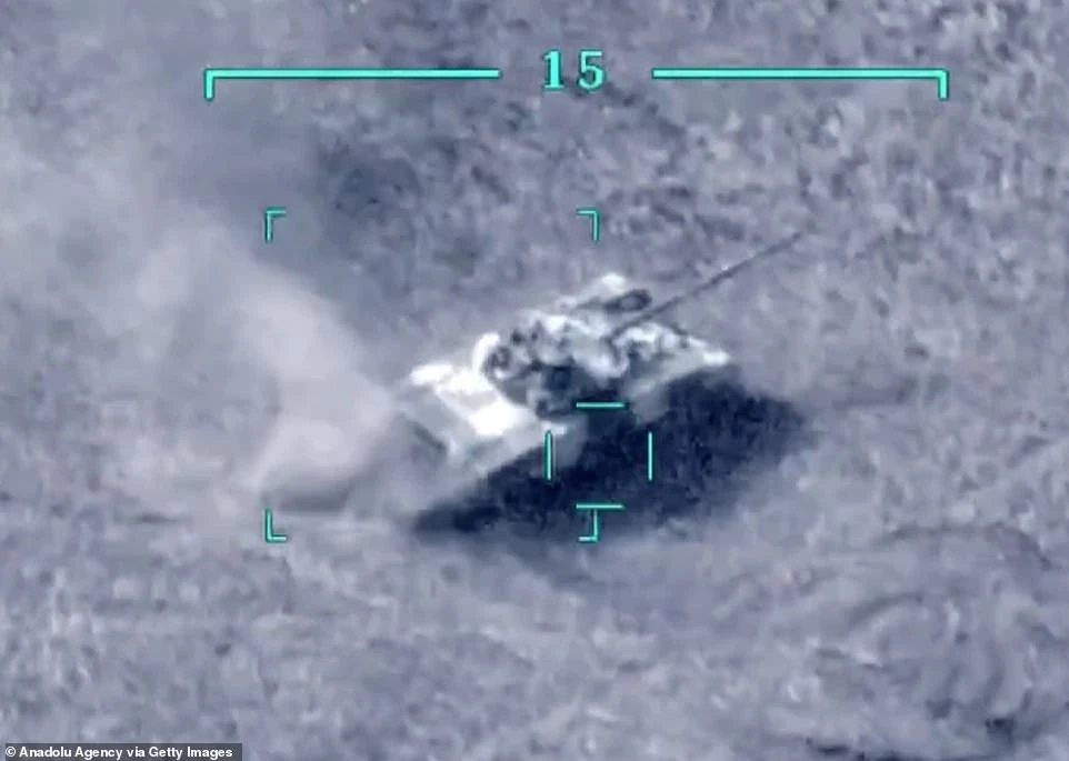 UAV Bayraktar TB2 của Azerbaijan theo dõi xe tăng T-72 của Armenia trong cuộc xung đột ở Nagorno-Karabakh trước khi kết liễu mục tiêu. Ảnh: DAILY MAIL