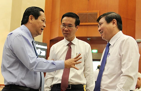 Phó Bí thư Thành ủy TP.HCM Nguyễn Thành Phong, Phó Bí thư Thường trực Thành ủy Võ Văn Thưởng, Phó Chủ tịch UBND TP Nguyễn Hữu Tín trao đổi bên hành lang kỳ họp. Ảnh: HOÀNG GIANG