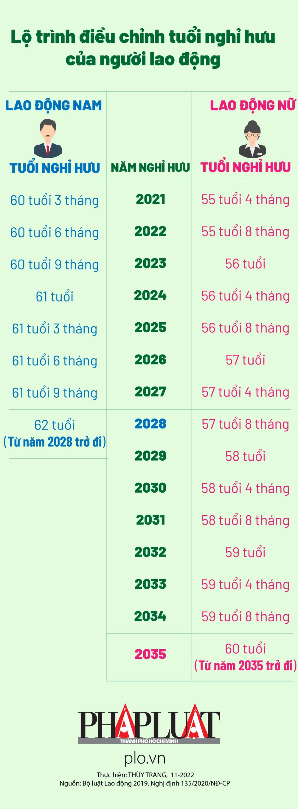 (PLO)- Theo Nghị định 135/2020, từ năm 2023 tuổi nghỉ hưu của lao động nam là 60 tuổi 9 tháng, tuổi nghỉ hưu của lao động nữ là 56 tuổi và tăng dần đến 2035 trở đi theo lộ trình điều chỉnh tuổi nghỉ hưu dưới đây.