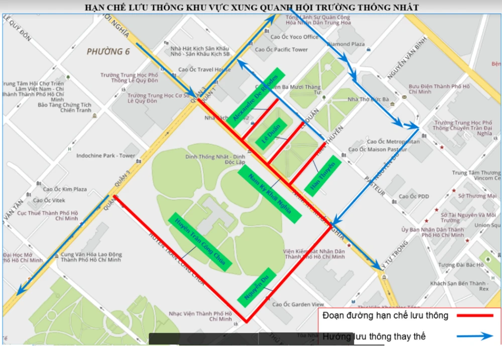 - Khu vực trước cổng Hội trường Thống Nhất số 135 Nam Kỳ Khởi Nghĩa (các đường Lê Duẩn, Alexandre de Rhodes, Hàn Thuyên đoạn từ đường Nam Kỳ Khởi Nghĩa đến đường Pasteur). Lộ trình thay thế: các phương tiện sẽ chuyển hướng lưu thông trên những khu vực không hạn chế như đường Phạm Ngọc Thạch hoặc Pasteur → Lê Duẩn → Hàn Thuyên hoặc Alexandre de Rhodes