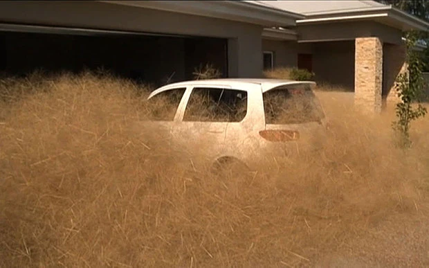 Cỏ lăn phủ kín cả ô tô (Ảnh: AFP)