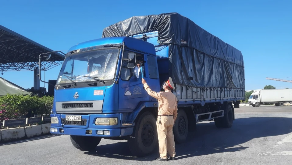 Tại các chốt kiểm soát, lực lượng chức năng kiểm tra nghiêm ngặt tài xế và các xe chở nhu yếu phẩm vào TP Vinh.