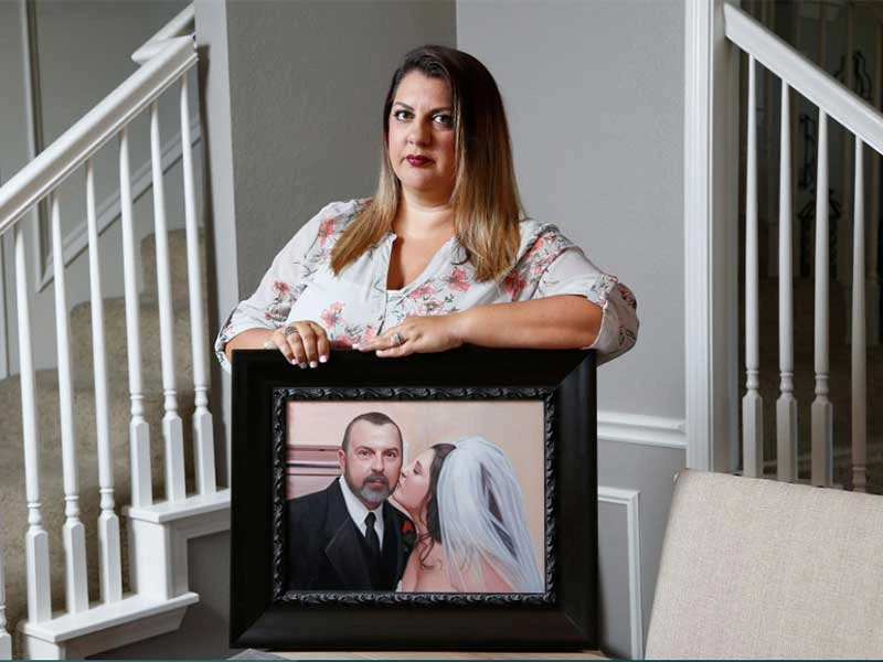 Cô Farrah Fasold bên bức ảnh của mình cùng cha khi còn sống. Ảnh: REUTERS