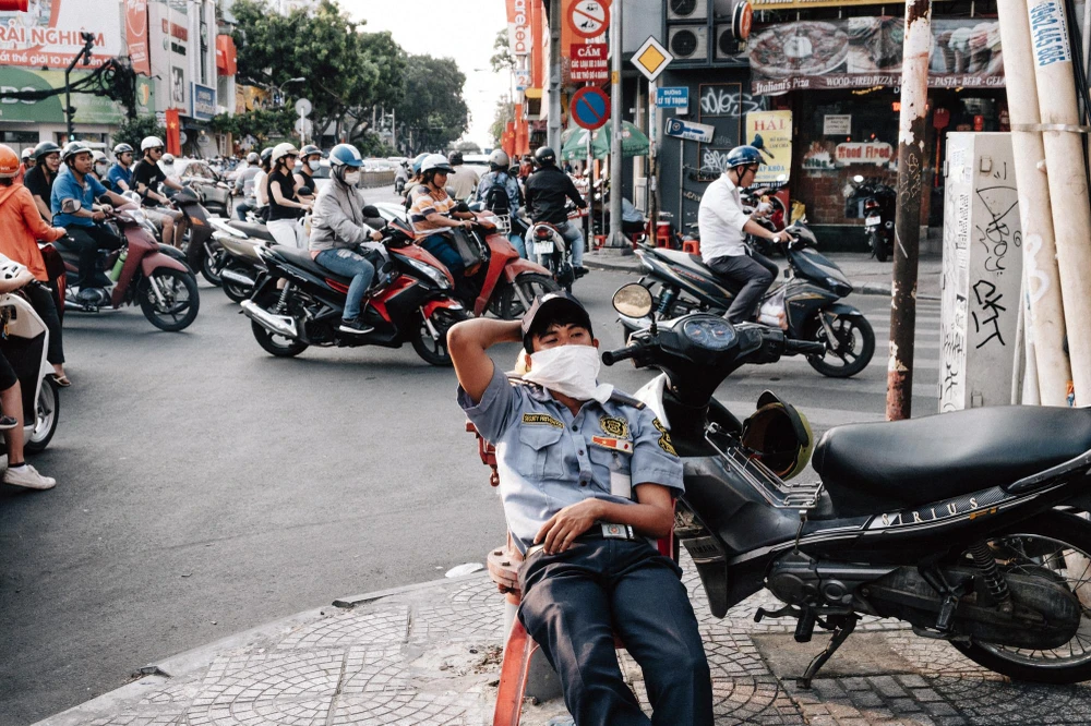Nhân viên bảo vệ che mũi mình khỏi không khí ô nhiễm và mùi gas bằng một tờ giấy.