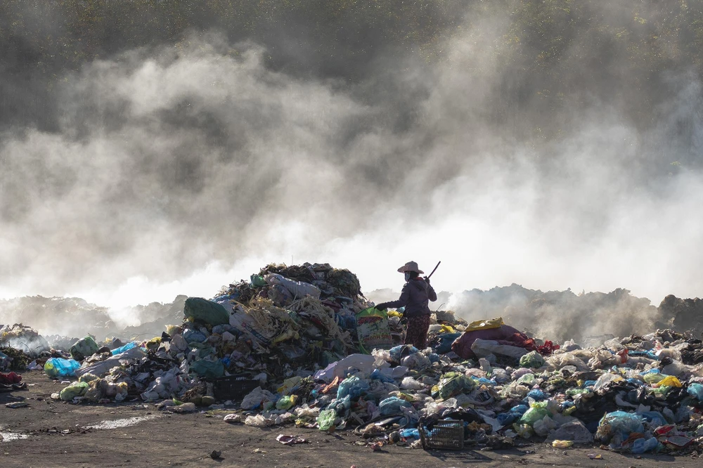 Người nhặt rác đang bới tìm rác trong bãi rác nằm giữa rừng cao su tại Đắk Can, Ngọc Hồi, Kon Tum đang bốc khói mù mịt với chiếc khẩu trang mỏng manh.