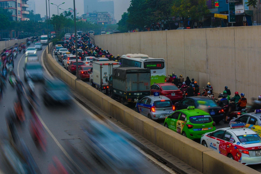 Một làn đường hầm cầu chui với kín mít ô tô xe máy nối đuôi nhau kín mít và chiều ngược lai xe cộ lao đi vun vút khi trời tối dần. Khí thải từ động cơ xăng, dầu phát ra ngoài không khí những lúc này là vô cùng ô nhiễm.