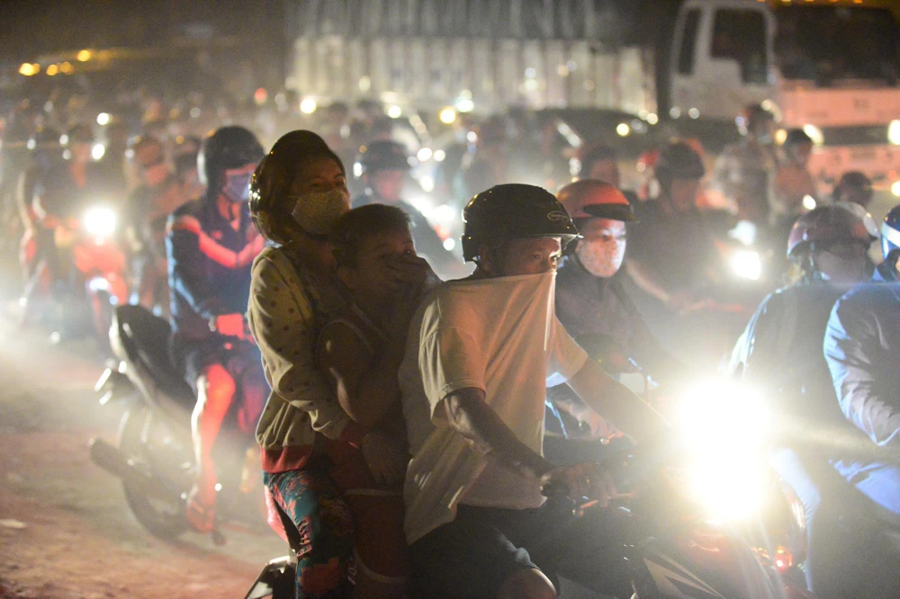 Người dân trở lại TP.HCM làm việc sau kỳ nghỉ lễ 30-4 và 1-5 phải lấy tay che mặt mũi vì đường đầy khói bụi. Ảnh chụp chiều tối ngày 2-5 tại đoạn đường từ cầu vượt nút giao Bình Thuận về hướng vòng xoay An Lạc, huyện Bình Chánh, TP.HCM.