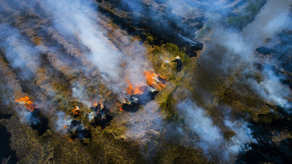 Một người đàn ông đang đốt rơm trên cánh đồng và những màu đen kèm khói của rơm tạo nên một khung cảnh ô nhiễm.