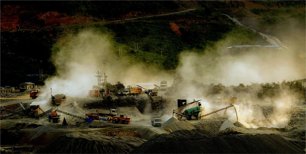 Khu sản xuất các loại đá theo cỡ để phục vụ các công trình xây dựng, cầu đường… tạo ra một làn bụi bay khắp nơi.