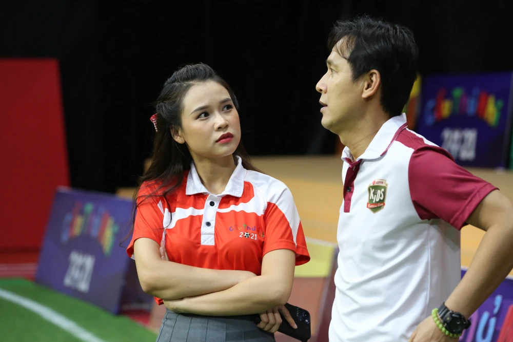 Phía MC Sam, Mâu Thuỷ cũng không kìm được xúc động khi mắt đỏ hoe chứng kiến các em nhỏ khóc nức nở trên sân bóng.