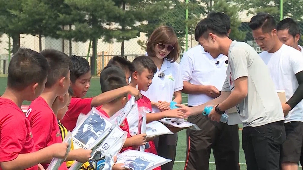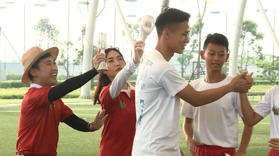 Không chỉ sở hữu vẻ ngoài điển trai, Đoàn Văn Hậu ghi điểm với khán giả bởi sự nhiệt tình của mình khi chỉ dạy cho các cầu thủ nhí từng li từng tí về kĩ năng chơi bóng.