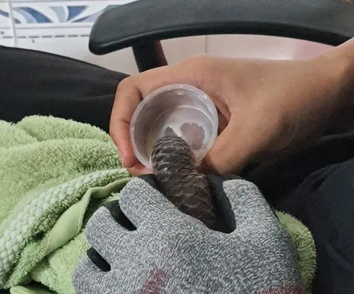 Chú tê tê tên Lộc vừa được một bạn trẻ (giấu tên) gửi đến Trung tâm Cứu hộ, bảo tồn và phát triển sinh vật. Ảnh: NVCC