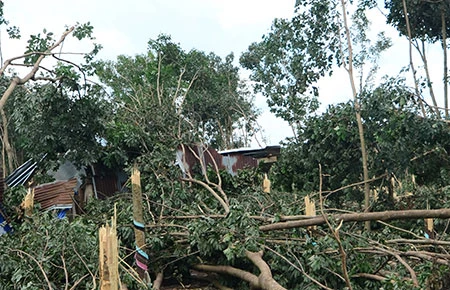 Cây cao su bật gốc đè sập mái nhà của người dân. Ảnh: PT