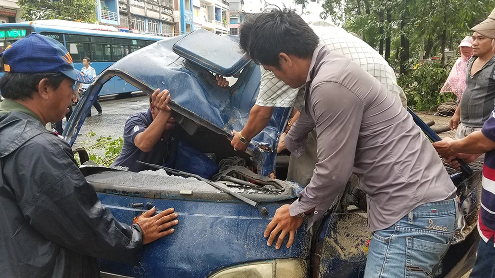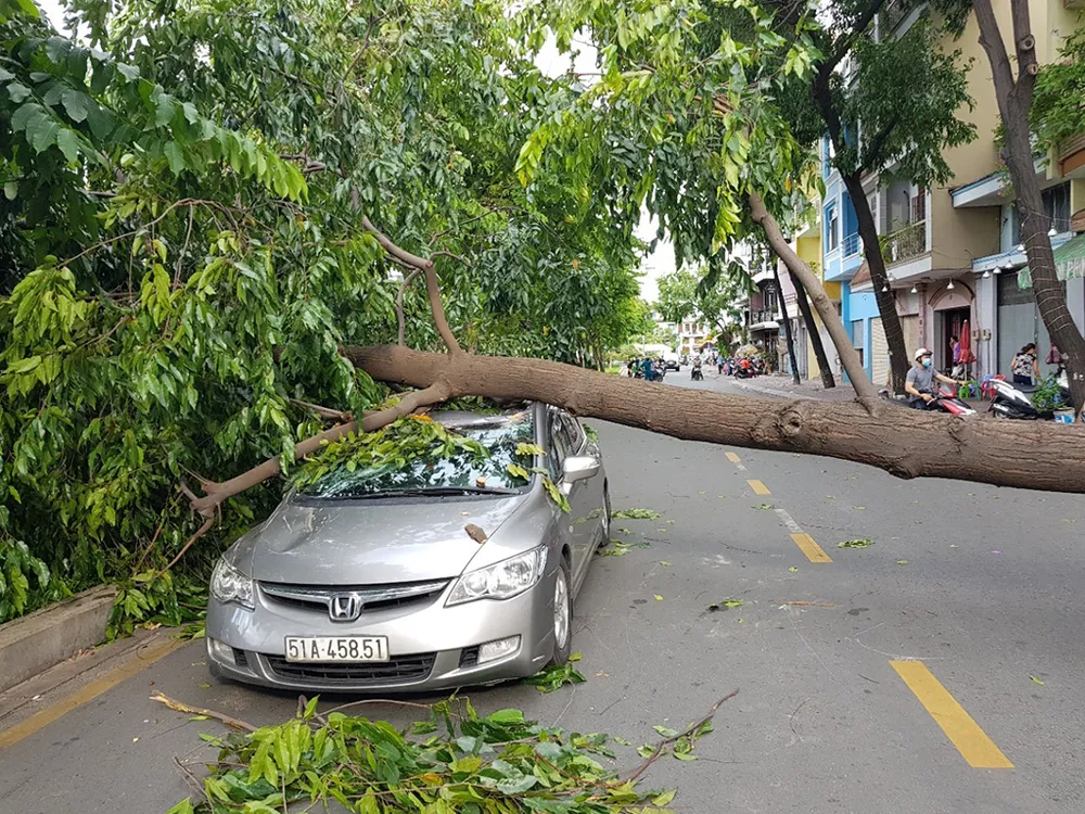 Trận mưa kèm giông lốc lớn đổ xuống nhiều địa bàn quận, huyện tại TP.HCM vào khoảng 15 giờ 30 chiều 7-5, khiến người dân gặp một phen hốt hoảng. Cụ thể, trước nhà 307 Hải Thượng Lãn Ông (phường 13, quận 5) một cây sao đen cao khoảng 6 m bất ngờ ngã đổ đè nát đầu một xe tải nhẹ đang đậu bên lề đường.