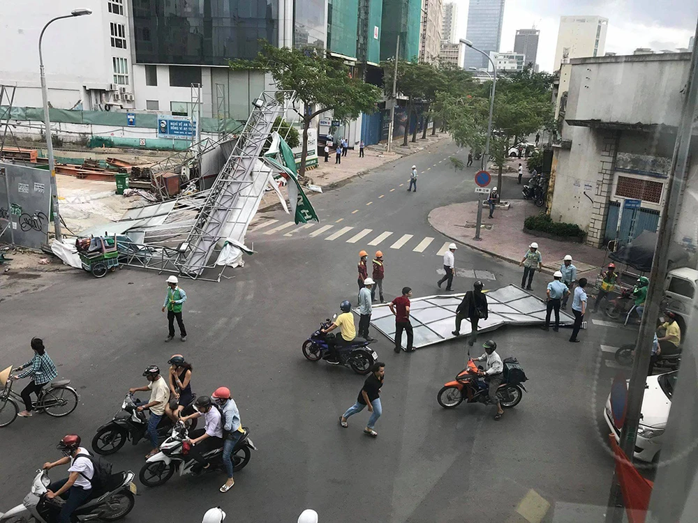 Còn tại giao lộ Đoàn Nhữ Hài-Nguyễn Trường Tộ (quận 4, TP.HCM) nhiều biển hiệu "khủng" của một công trình xây dựng bị gió giật văng xuống đường khiến nhiều người khiếp vía. Hiện trường biển hiệu văng tứ tung trên đường gây nguy hiểm cho người tham gia giao thông.