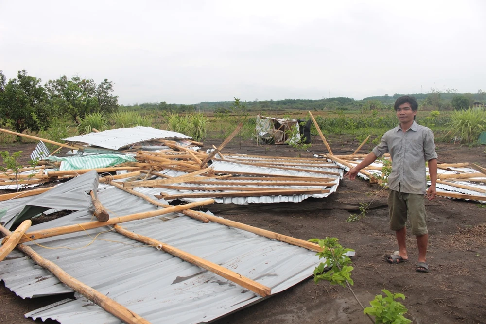 Chị Ngàn Cấm Mùi (ngụ xã Tân Tiến, là một trong những hộ ảnh hưởng nặng nề) cho biết: Khoảng 18 giờ ngày 20-3, trận mưa lớn kéo đến bất ngờ có lốc xoáy cuồn cuộn giật toang cửa nhà, toàn bộ mái sau đó xiêu vẹo theo gió cuốn. Chủ nhà bị cánh cửa đập vào làm gãy tay phải. Chưa hết, toàn bộ vườn tiêu 3.000 trụ hơn bốn, năm tuổi nằm sạp xuống đất.