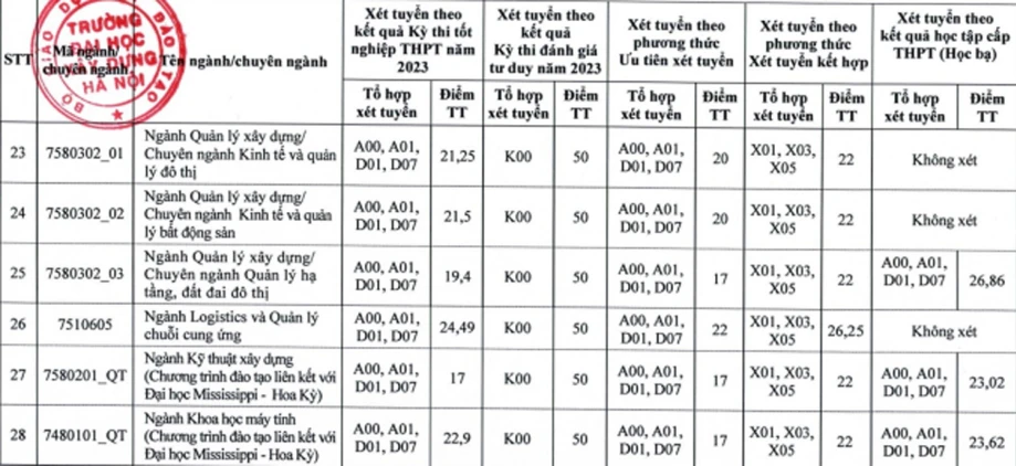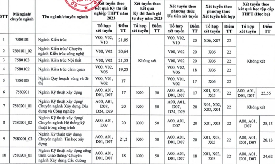 Điểm chuẩn của trường Đại học Xây dựng năm 2023 dao động từ 17 - 24,49 điểm.