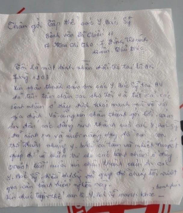 Bệnh nhân COVID-19 xuất viện viết thư trên giấy ăn gửi tập thể Bệnh viện Dã chiến số 11 do Bệnh viện Nhi đồng 2 phụ trách. Ảnh: NVCC