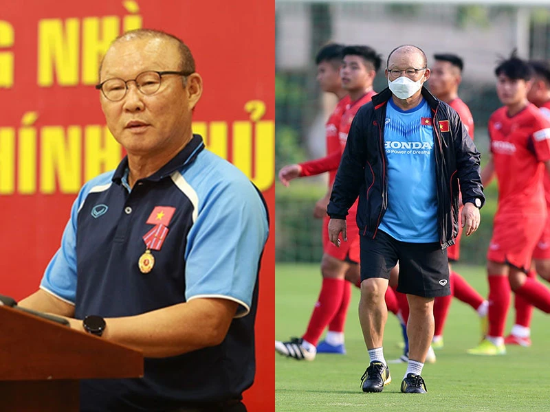HLV chia sẻ sau khi nhận huân chương Lao động hạng Nhì. Ảnh: CTV. HLV Park Hang-seo trong đợt đãi cát tìm vàng lứa U-22 Việt Nam. Ảnh: NGỌC DUNG