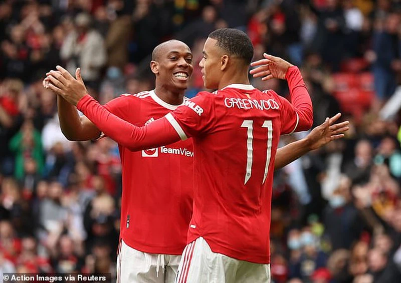Martial với cái đầu vừa cạo trọc ăn mừng bàn thắng cùng Greenwood trong trận giao hữu MU thắng Everton 4-0. ẢNH: REUTERS