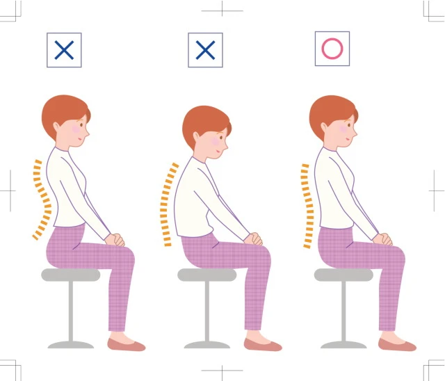 Một tư thế ngồi đúng là lưng phải thẳng và tránh khom người ra phía trước. Sức nặng của cơ thể cần được phân bố đều lên mỗi khớp háng. Bàn chân nên đặt phẳng trên mặt đất và cẳng chân vuông góc với đùi (đầu gối gập 90 độ).