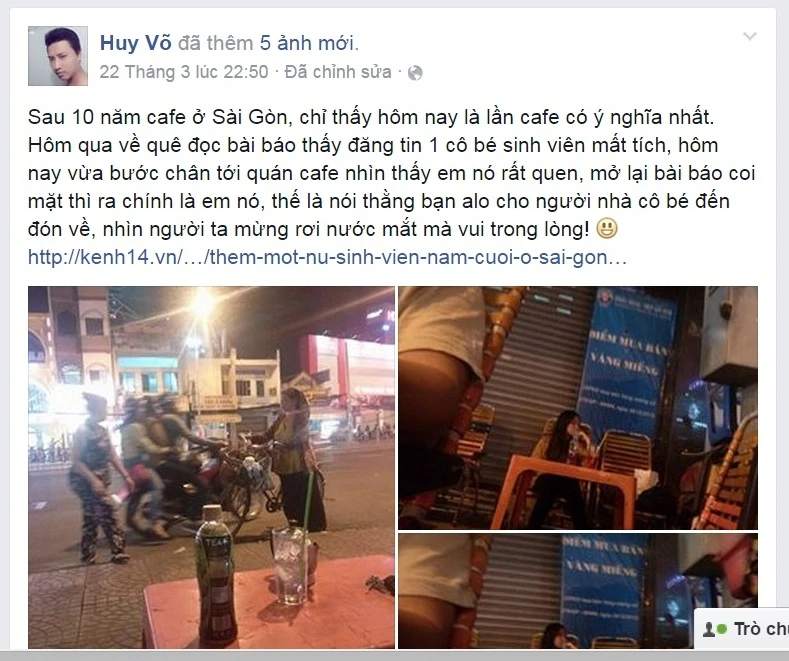“Sau 10 năm cafe ở Sài Gòn, chỉ thấy hôm nay là lần cafe có ý nghĩa nhất. Hôm qua về quê đọc bài báo thấy đăng tin 1 cô bé sinh viên mất tích, hôm nay vừa bước chân tới quán cafe nhìn thấy em nó rất quen, mở lại bài báo coi mặt thì ra chính là em nó, thế là nói thằng bạn alo cho người nhà cô bé đến đón về, nhìn người ta mừng rơi nước mắt mà vui trong lòng!”