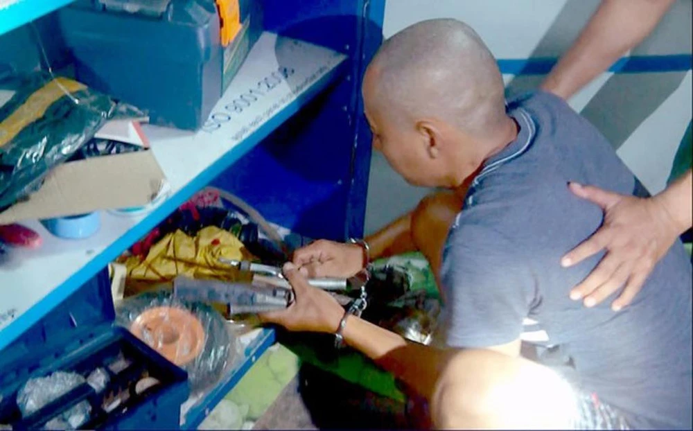Trần Hoàng Nhất Hùng khai nơi cất giấu dụng cụ, thiết bị chế tạo vũ khí. Ảnh do Công an Khánh Hòa cung cấp