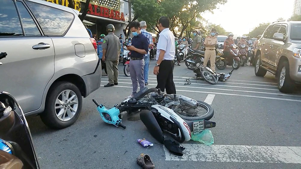 Trinh sát truy đuổi đến giao lộ Trần Văn Giàu – Tên Lửa (phường Bình Trị Đông B, quận Bình Tân), hai xe máy của nhóm cướp giật va chạm với ô tô đang dừng đèn đỏ.