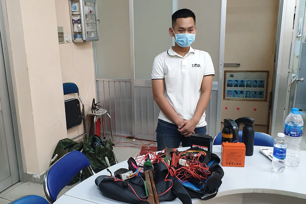 Hào và số tang vật gồm súng bắn chó, bình xịt hơi cay. Ảnh: NT
