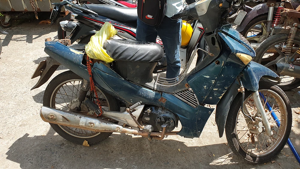 Chiếc xe máy kéo xe lôi bị công an tạm giữ. Ảnh: NT
