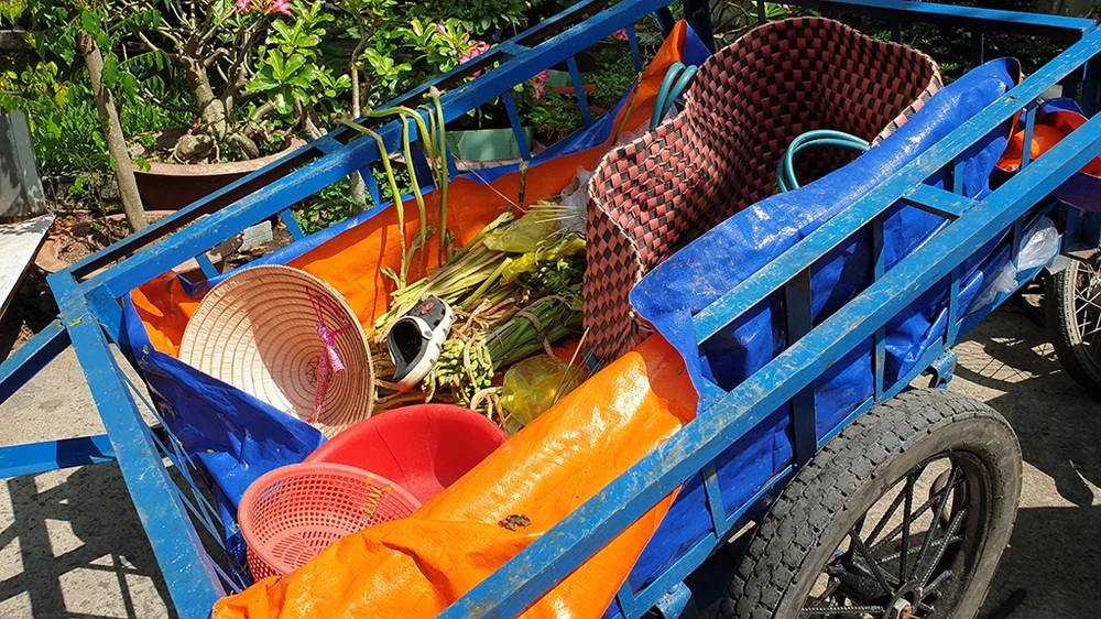 Tổ công tác tới trước số 266 Lê Đình Cẩn thì phát hiện ba cha con Vũ đang chở rau đi bán.